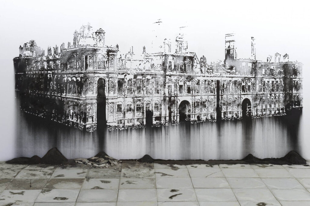 Récipiendaire du Prix des Amis du Palais de Tokyo en 2018, Nicolas Daubanes a pu présenter son travail au sein de l’Institution en 2020. Intitulée « L’Huile et L’Eau », son exposition a marqué le public avec ses grands dessins muraux en limaille de fer, dont cette reproduction de l’Hôtel de ville de Paris incendié durant la Commune en 1871 / Courtesy Nicolas Daubanes et Palais de Tokyo © Marc Domage