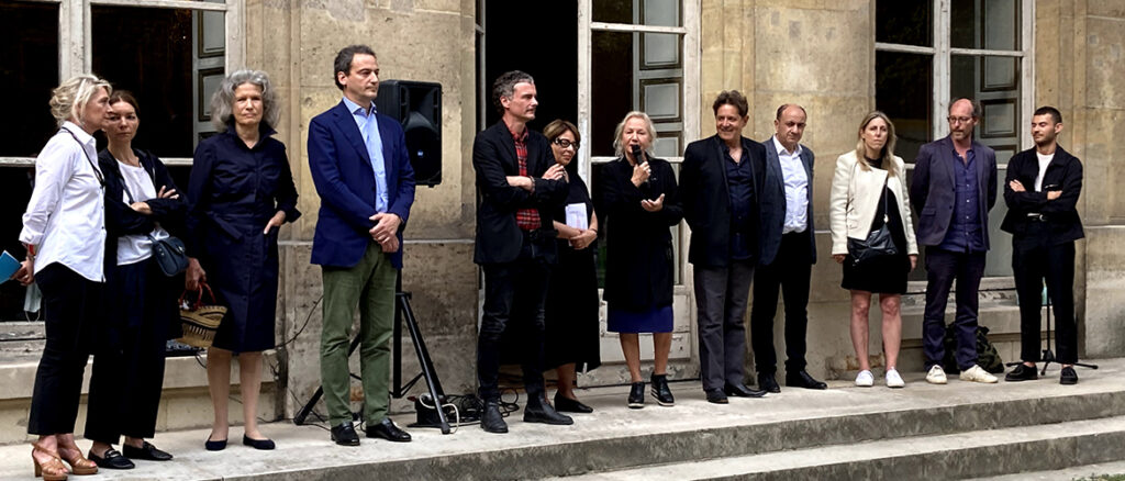 Au centre, tenant le micro, la cheffe d’entreprise agnès b cumule les étiquettes de collectionneuse, de galeriste, de directrice de sa propre fondation d’art contemporain, mais aussi de fondatrice et de présidente de l’Association des Amis des Beaux-Arts de Paris, qui remet chaque année plusieurs prix à de jeunes artistes diplômés. Photo/source : beauxartsparis.fr