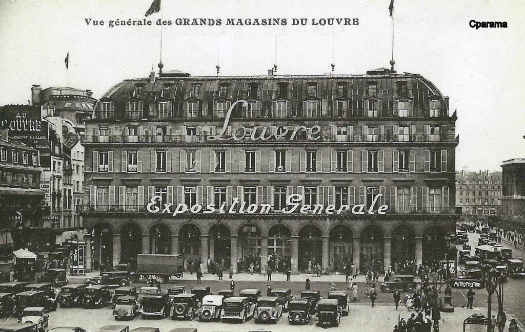 Hôtel de luxe, Grands Magasins, consortium d’antiquaires, l’adresse occupée désormais par la Fondation Cartier a connu bien des vies depuis son édification en 1855. Ci-dessus, une vue générale des Grands Magasins du Louvre vers 1930 (carte postale / source : CPArama.com).