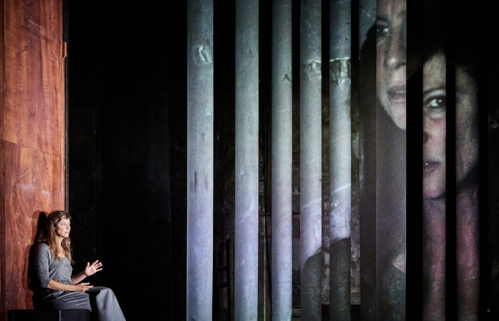 Les premières saillies verbales des comédiennes ne laissent d’ailleurs aucun doute : sur scène la parole sera reine, quitte à heurter par sa radicalité. Les décors, économes de toute fioriture, font place nette aux mots : une table faiblement éclairée d’un côté, vestige du lieu de “l’évènement”, un large rideau strié de l’autre, d’où émerge par intermittence Anna Mouglalis, fondue au cadre dans ses vêtements gris. La scénographie, tout en justesse, ne laisse ainsi au public que peu d’échappatoires.